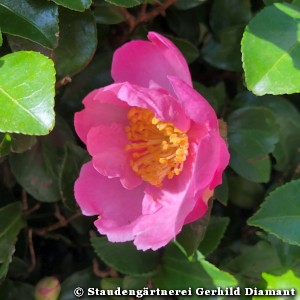 Die Herbst-Kamelie wird 4-6 m hoch, etwa 3 m breit und wächst etwas kompakter als die frühjahrsblühende Camellia japonica, ein Schnitt ist also nicht nötig.